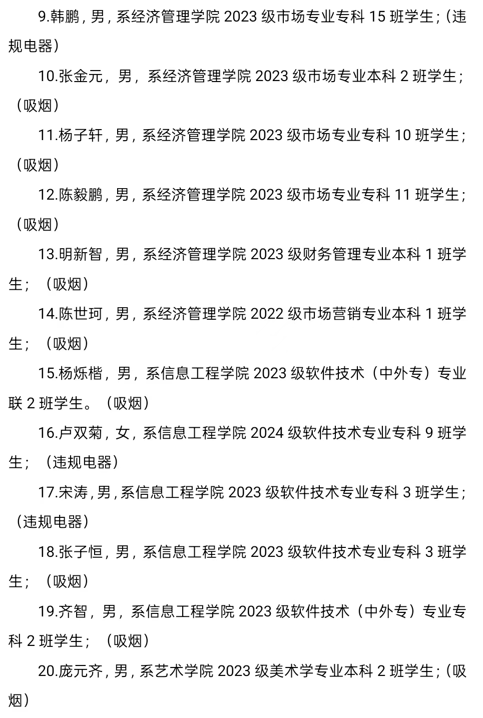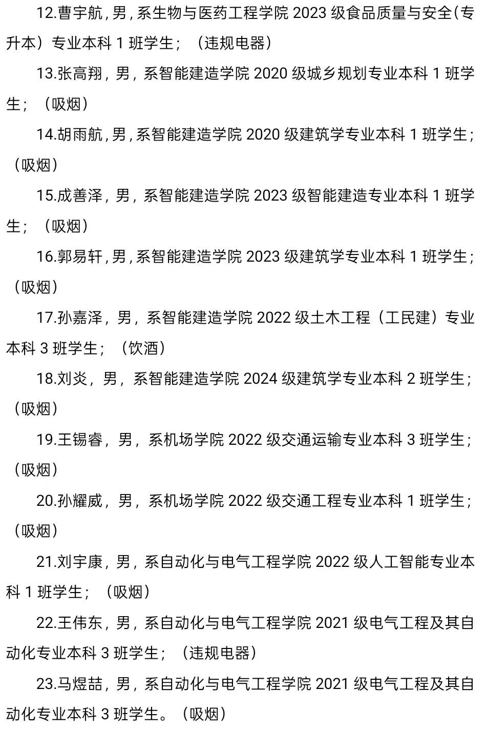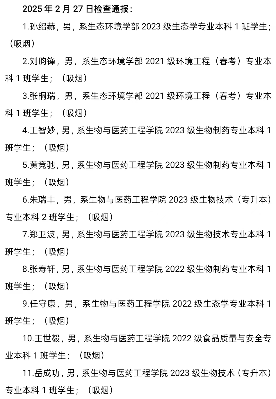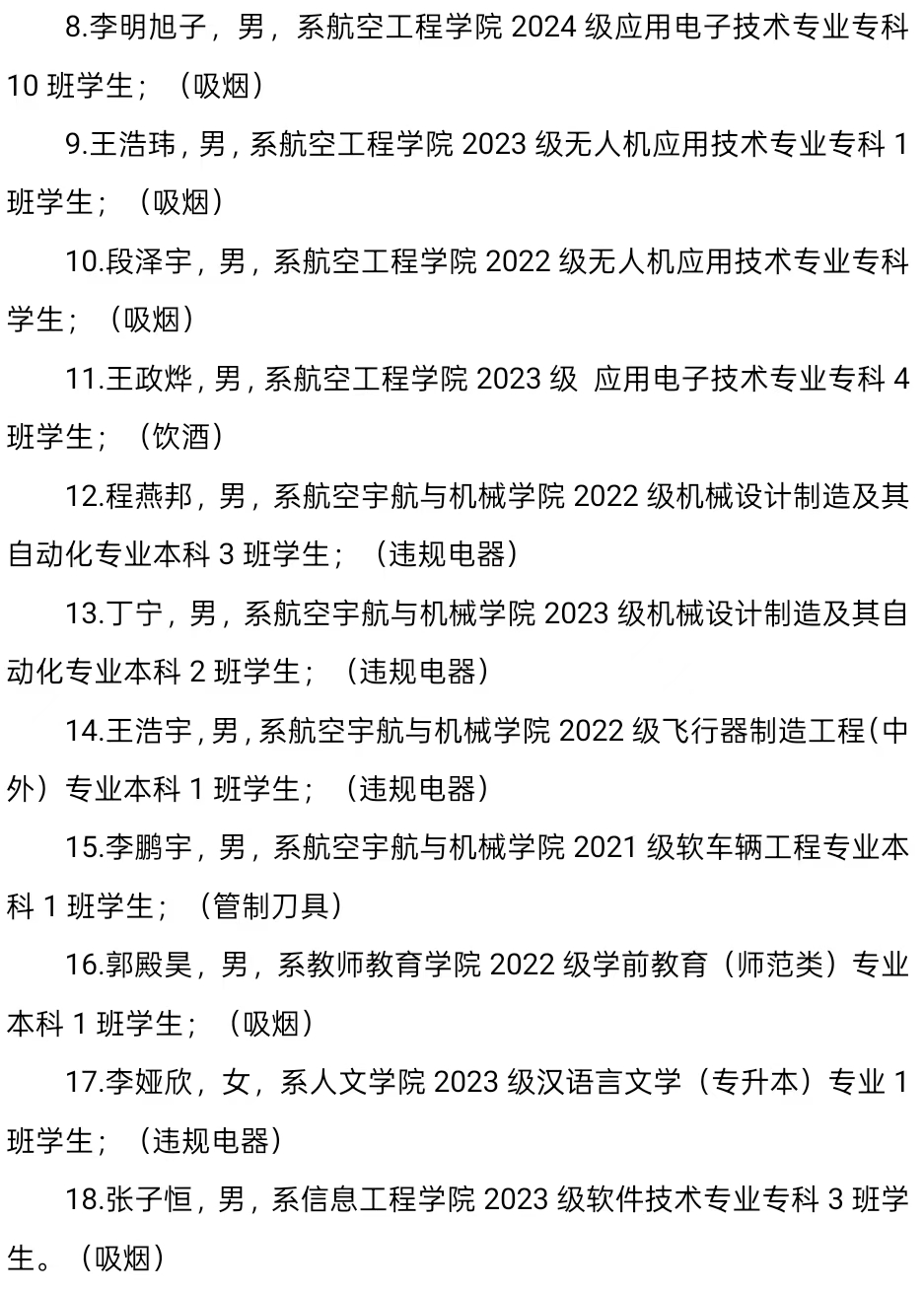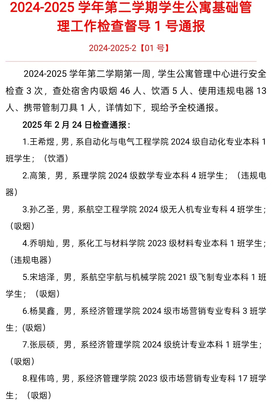 2024-2025学年第二学期第一周,学生公寓管理中心进行安全检查3次,查处宿舍内吸烟46人、饮酒5人、使用违规电器13人、携带管制刀具1人,详情如下,现给予全校通报。