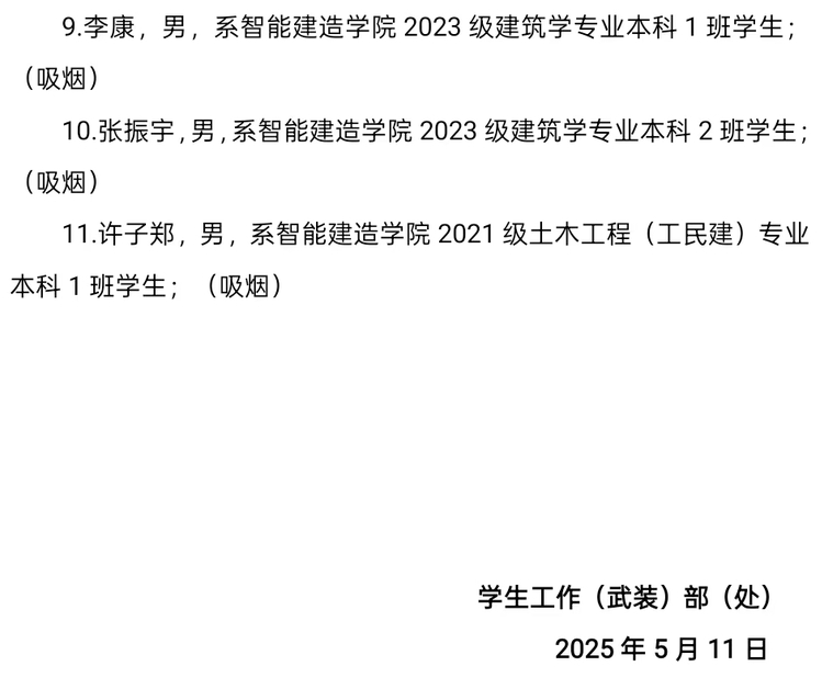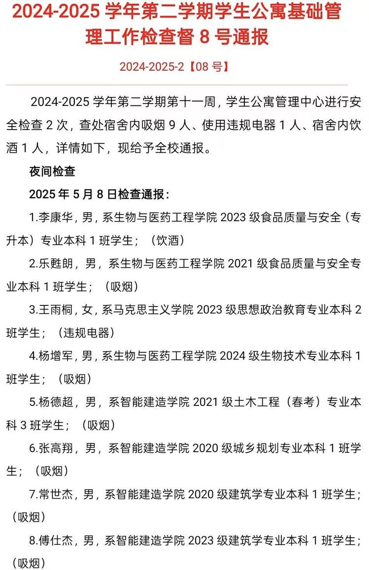 2024-2025学年第二学期第十一周,学生公寓管理中心进行安全检查2次,查处宿舍内吸烟9人、使用违规电器1人、宿舍内饮酒1人,详情如下,现给予全校通报。