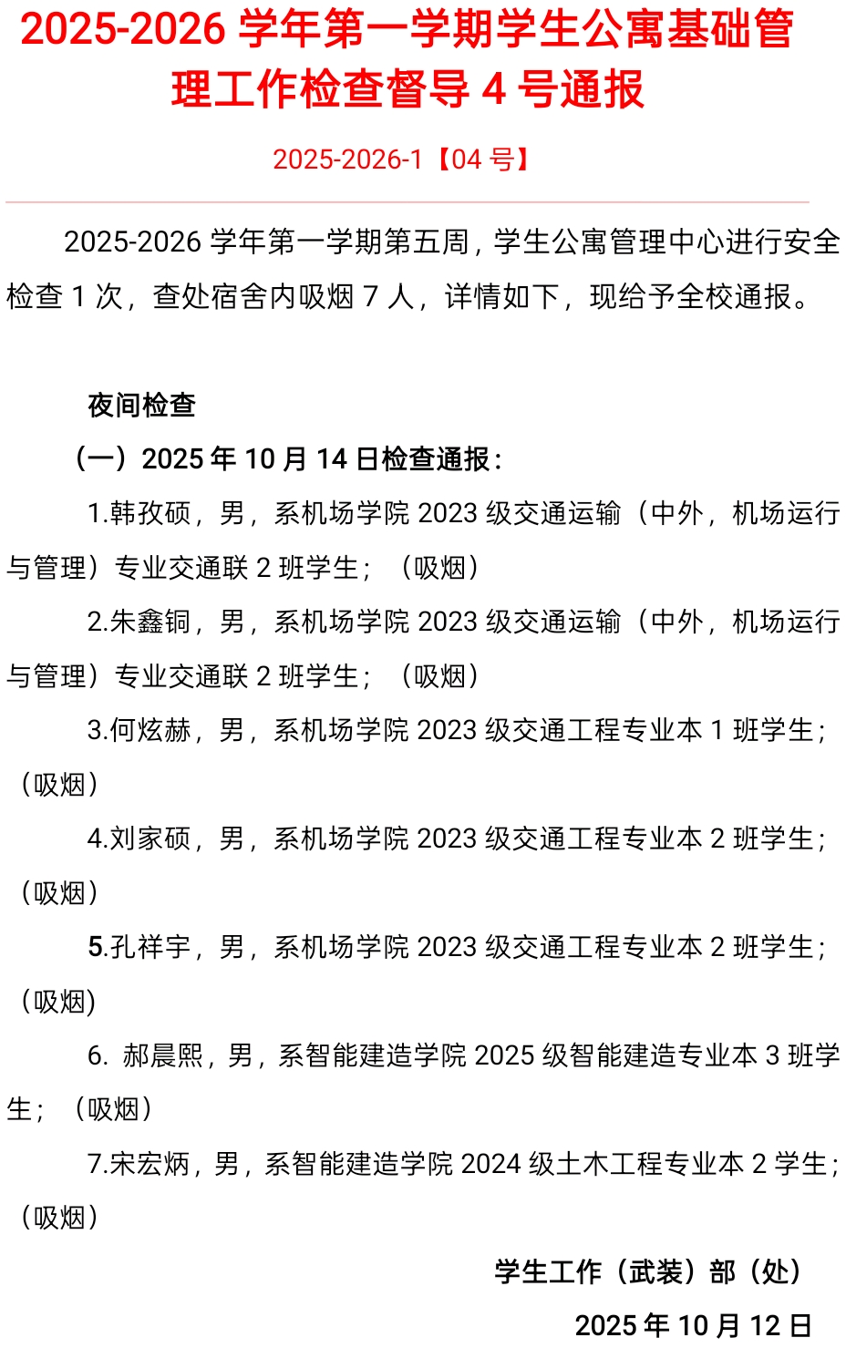 2025-2026学年第一学期第五周,学生公寓管理中心进行安全检查1次,查处宿舍内吸烟7人,详情如下,现给予全校通报。