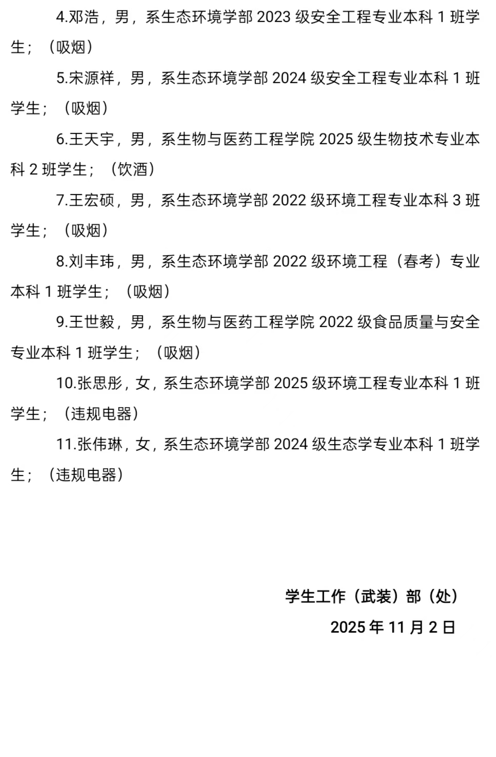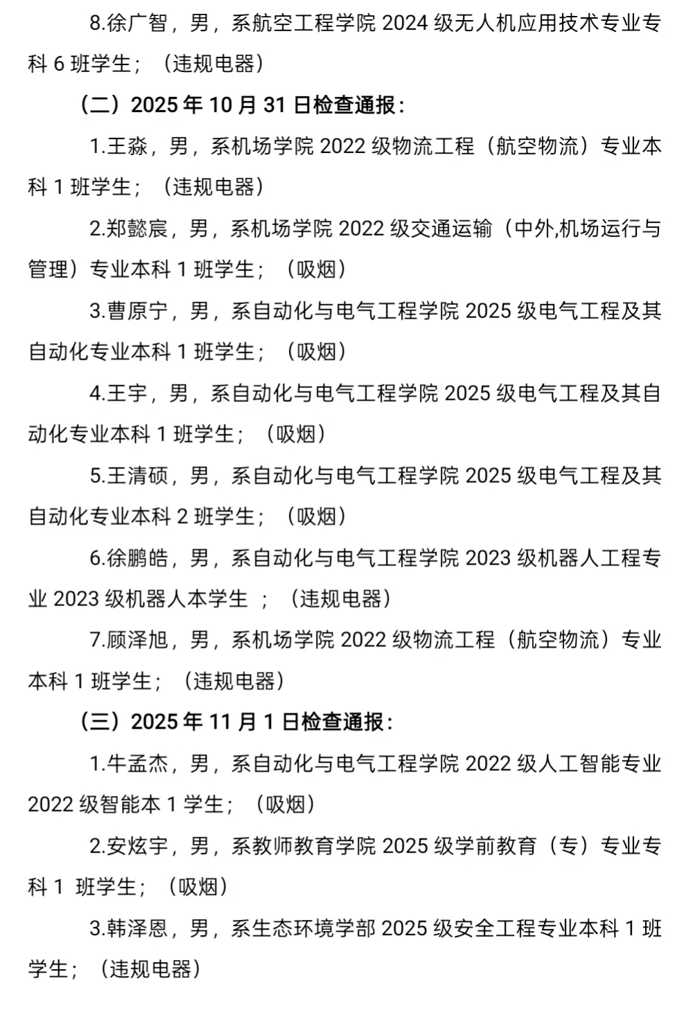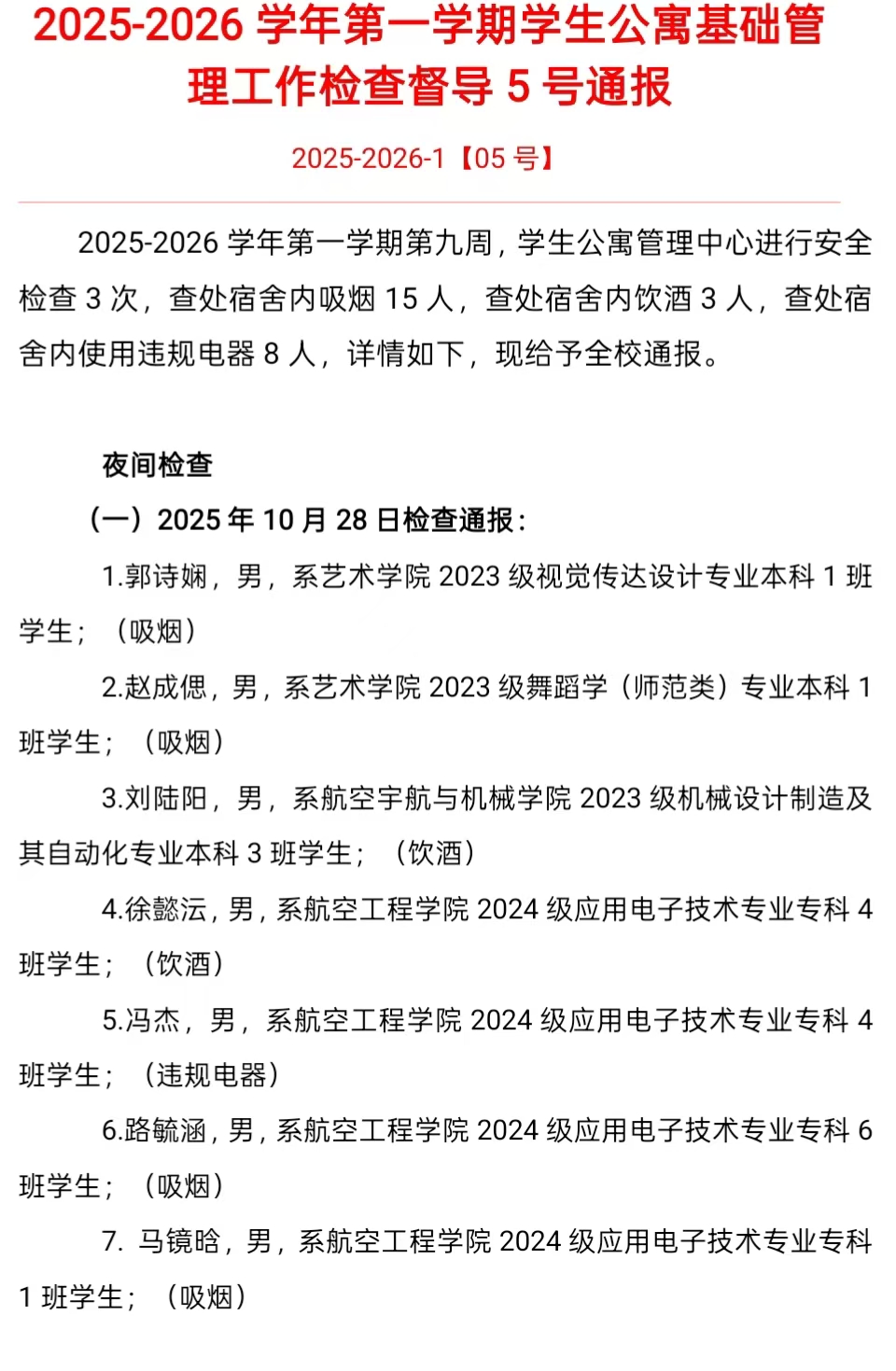 2025-2026学年第一学期第九周,学生公寓管理中心进行安全检查3次,查处宿舍内吸烟15人,查处宿舍内饮酒3人,查处宿舍内使用违规电器8人,详情如下,现给予全校通报。