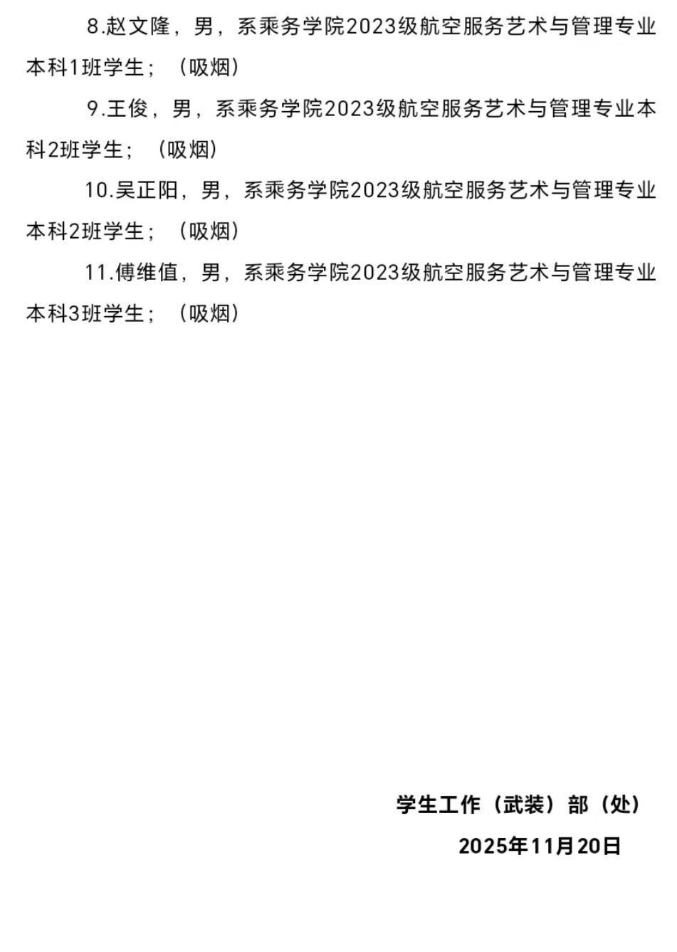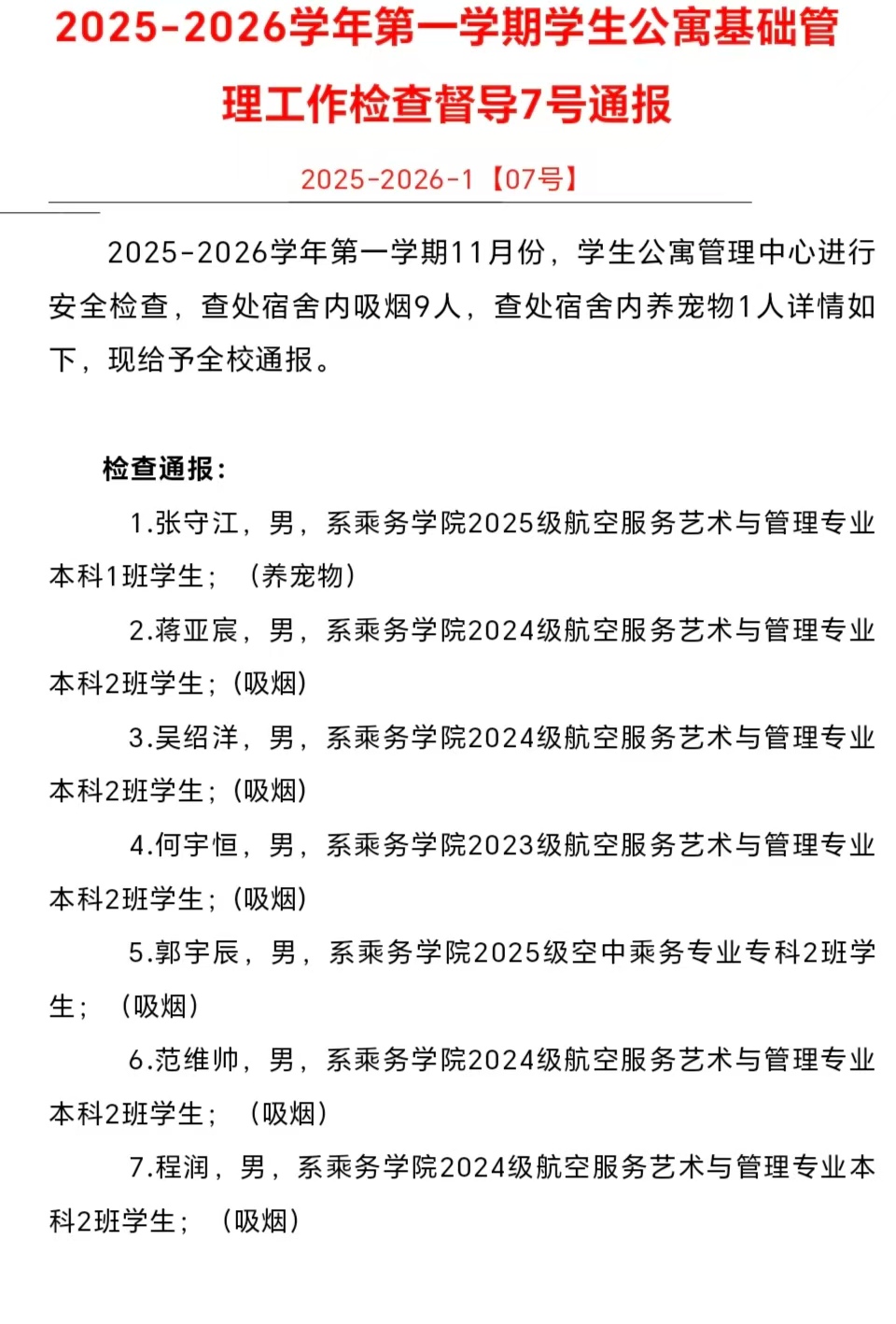 2025-2026学年第一学期11月份,学生公寓管理中心进行安全检查,查处宿舍内吸烟9人,查处宿舍内养宠物1人详情如下,现给予全校通报。