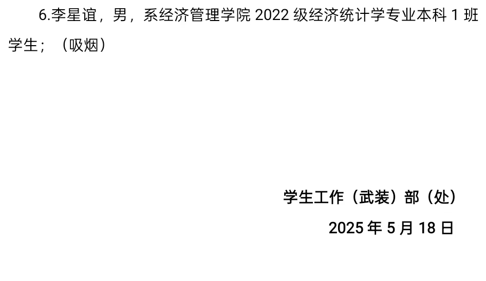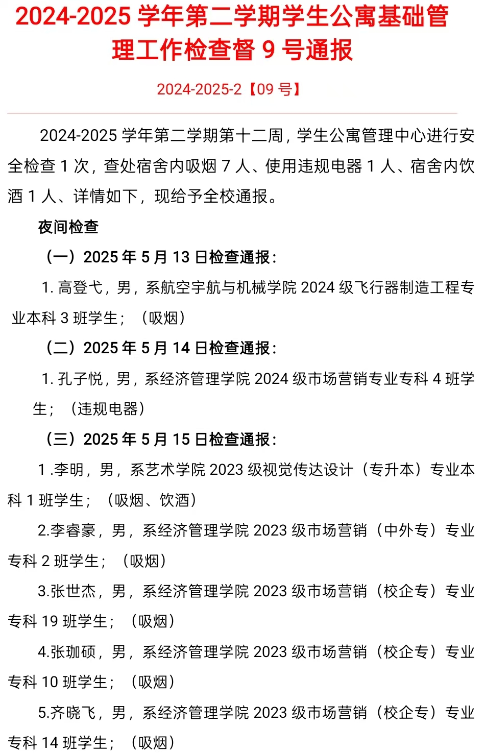 2024-2025学年第二学期第十二周,学生公寓管理中心进行安全检查1次,查处宿舍内吸烟7人、使用违规电器1人、宿舍内饮酒1人、详情如下,现给予全校通报。
