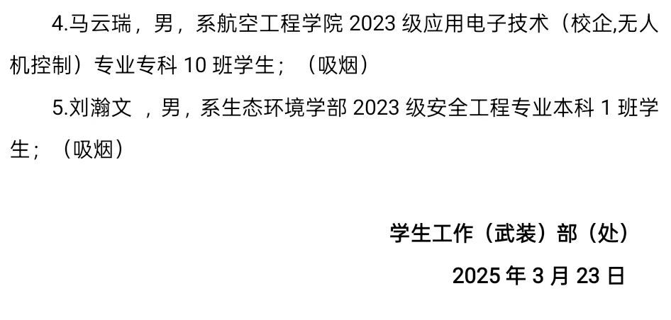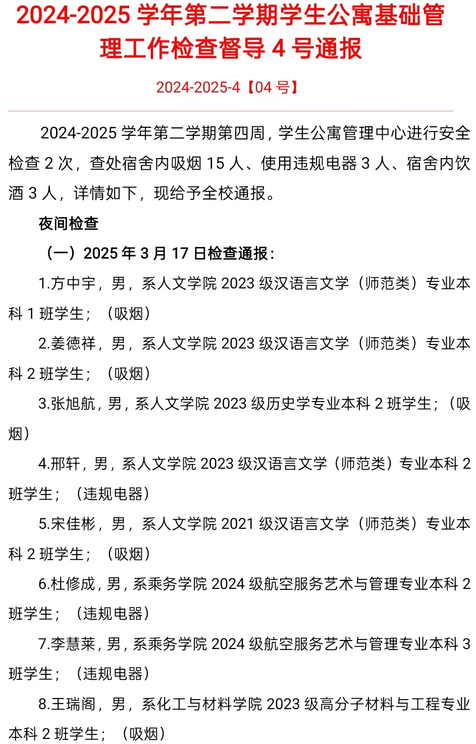 2024-2025学年第二学期第四周,学生公寓管理中心进行安全检查2次,查处宿舍内吸烟15人、使用违规电器3人、宿舍内饮酒3人,详情如下,现给予全校通报。