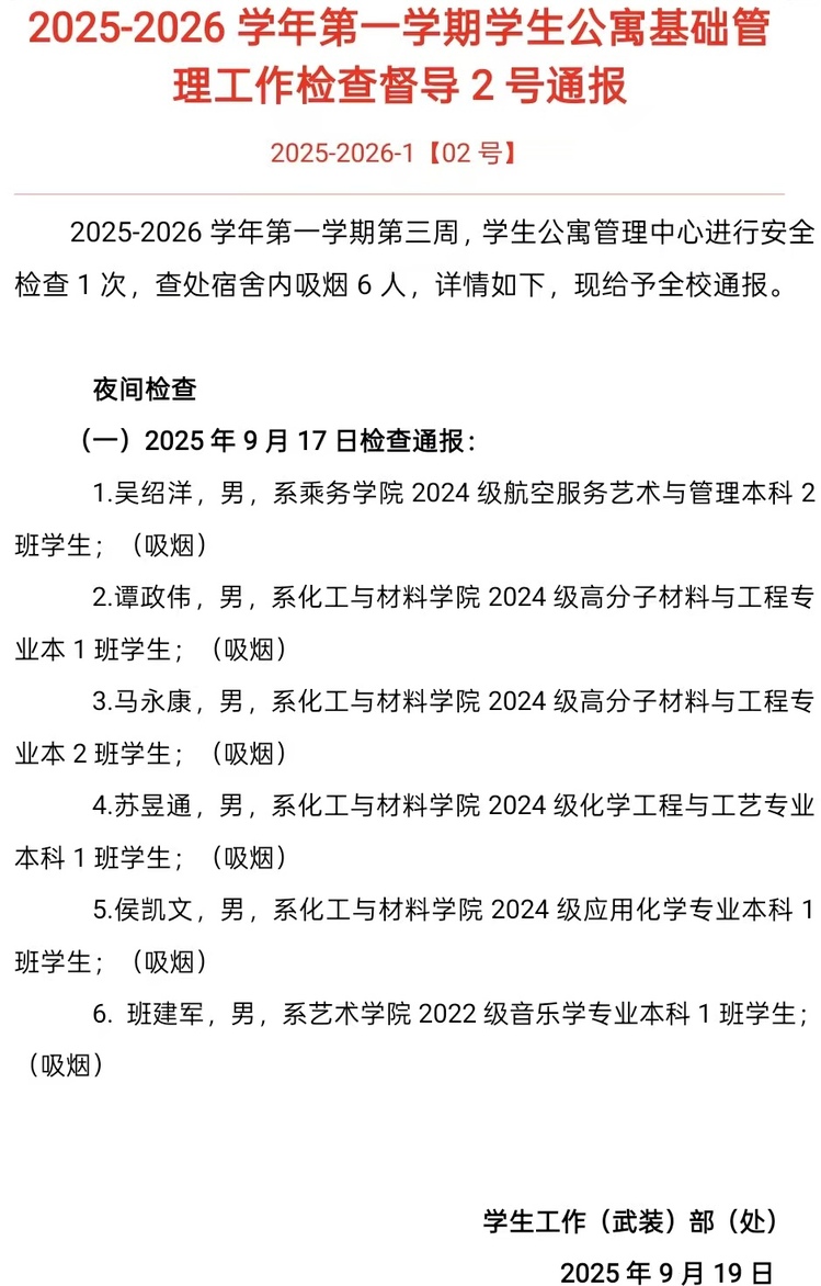 2025-2026学年第一学期第三周,学生公寓管理中心进行安全检查1次,查处宿舍内吸烟6人,详情如下,现给予全校通报。