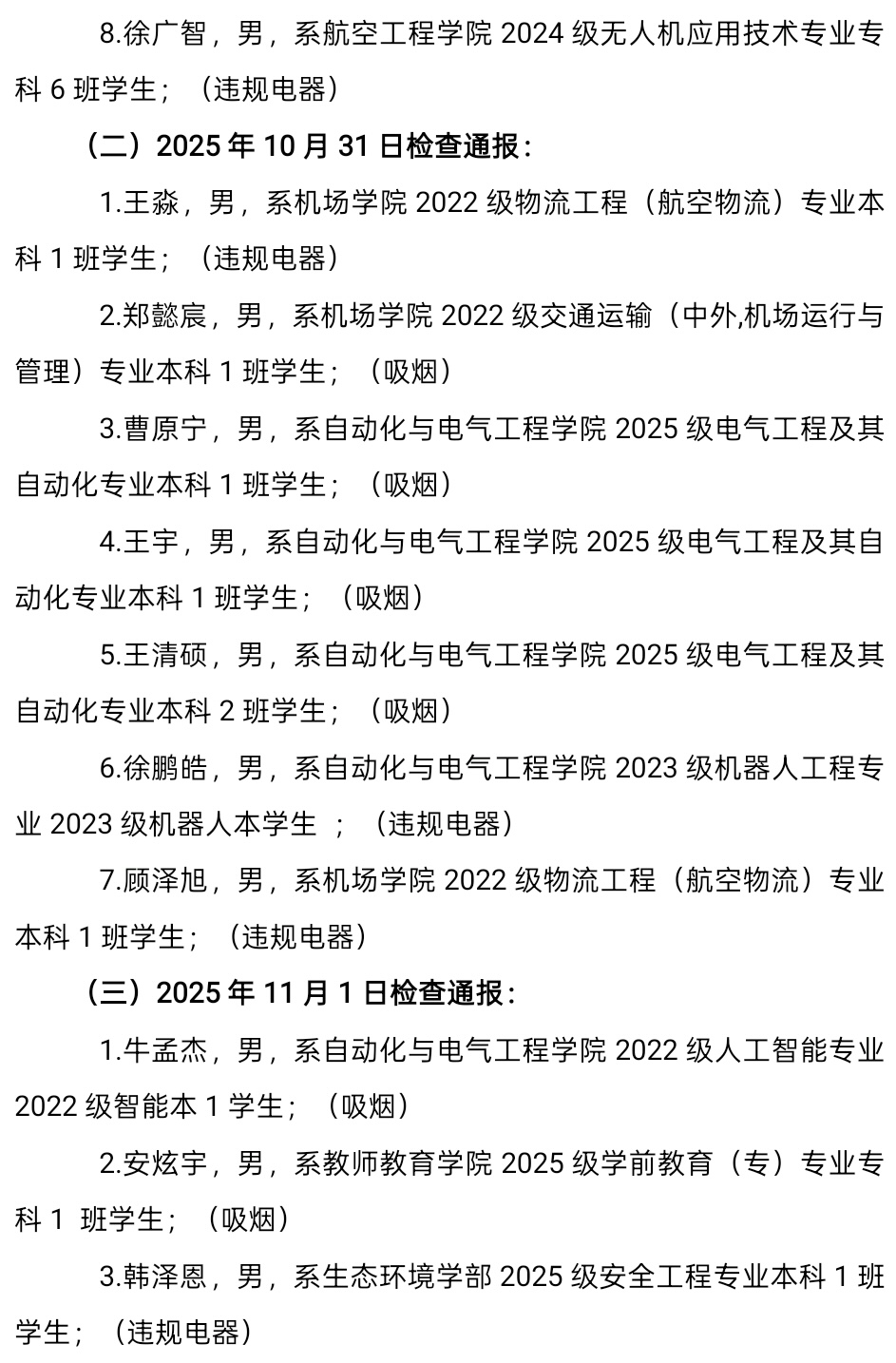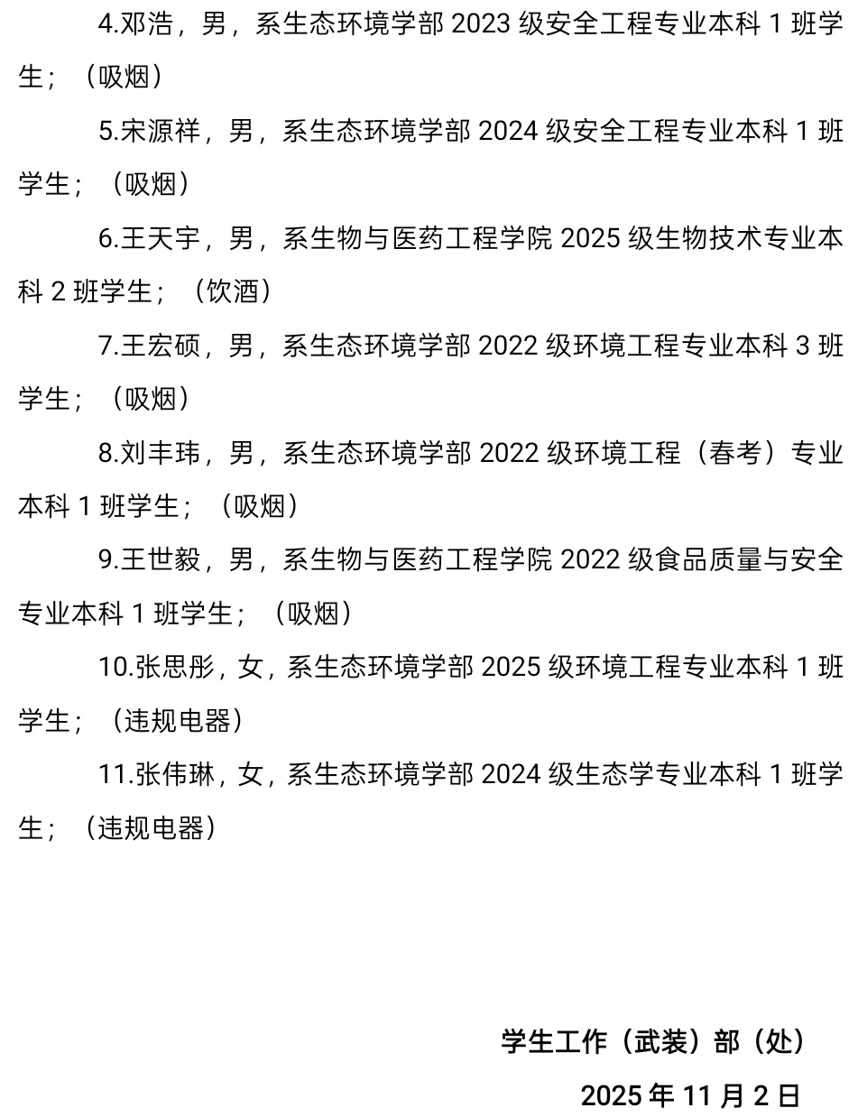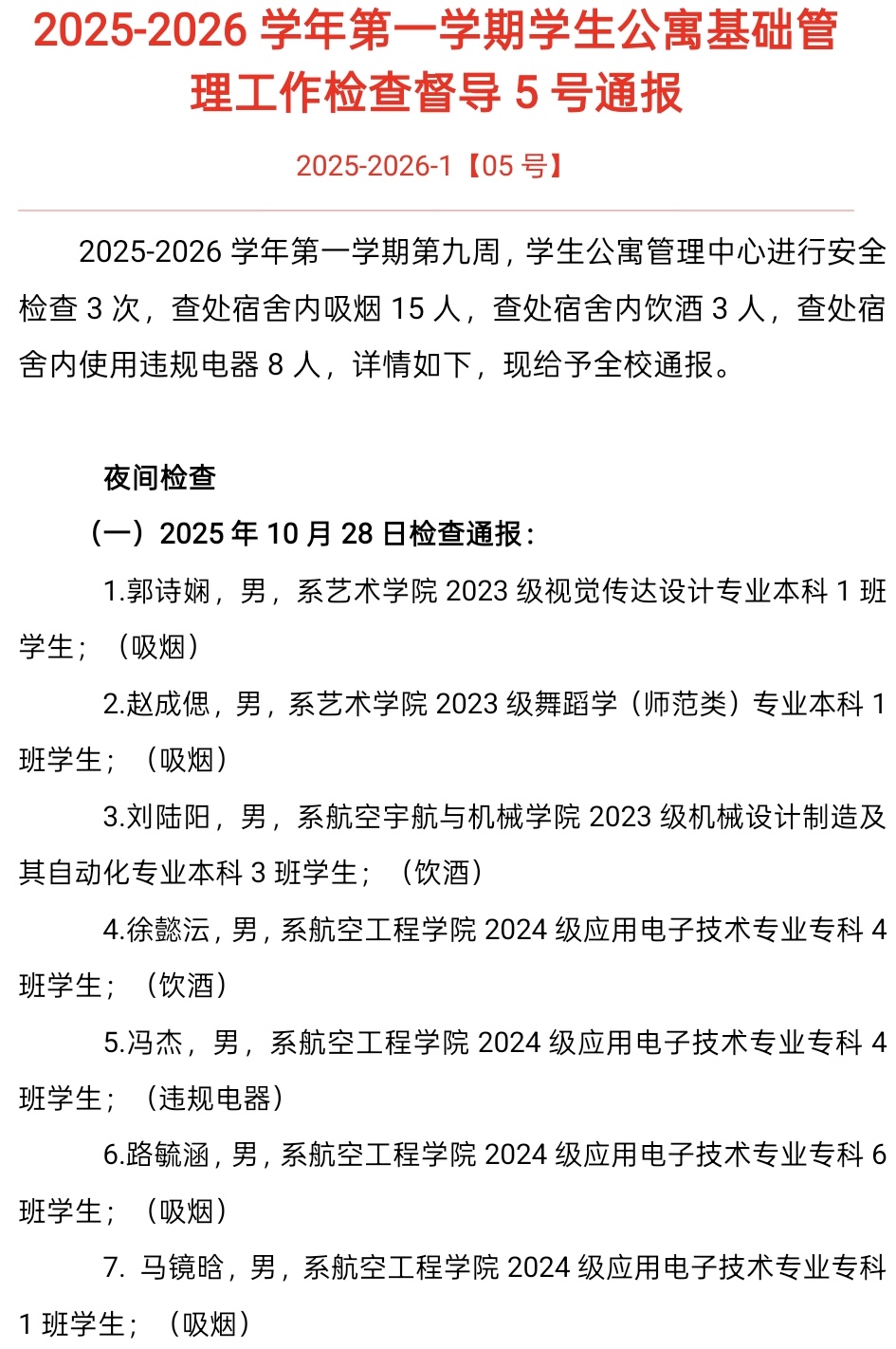 2025-2026学年第一学期第九周,学生公寓管理中心进行安全检查3次,查处宿舍内吸烟15人,查处宿舍内饮酒3人,查处宿舍内使用违规电器8人,详情如下,现给予全校通报。