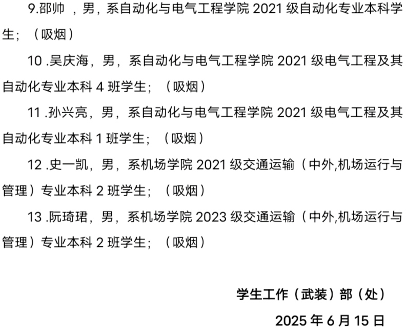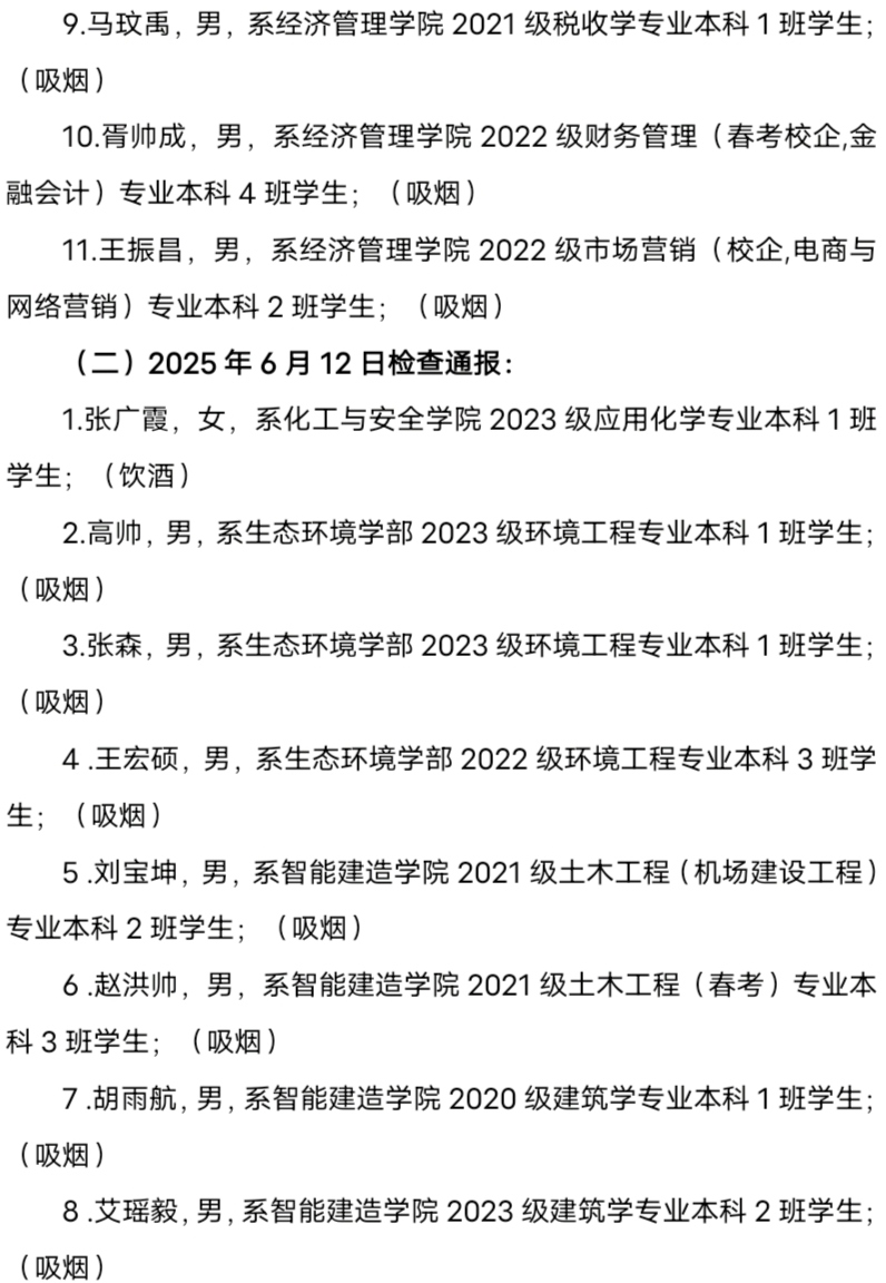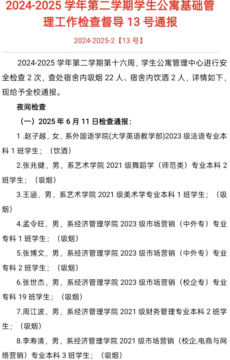 2024-2025学年第二学期第十六周,学生公寓管理中心进行安全检查2次,查处宿舍内吸烟22人、宿舍内饮酒2人,详情如下,现给予全校通报。