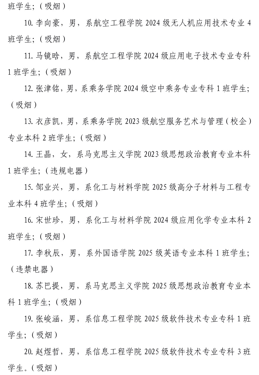 2025-2026学年第二学期第一周,学生公寓管理中心进行安全检查2次,共查处31人,其中吸烟24人、饮酒3人、使用违禁电器4人,详情如下,现给予全校通报。