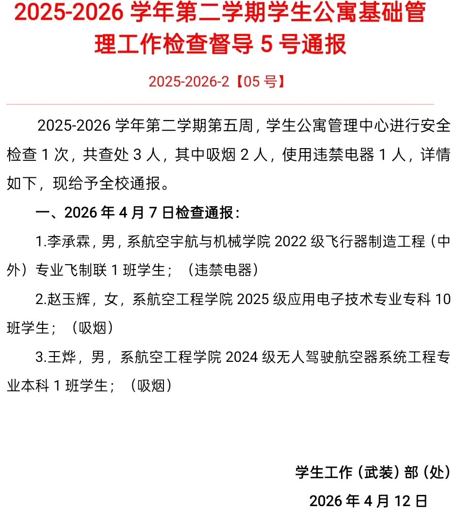 2025-2026学年第二学期第五周,学生公寓管理中心进行安全检查1次,共查处3人,其中吸烟2人,使用违禁电器1人,详情如下,现给予全校通报。